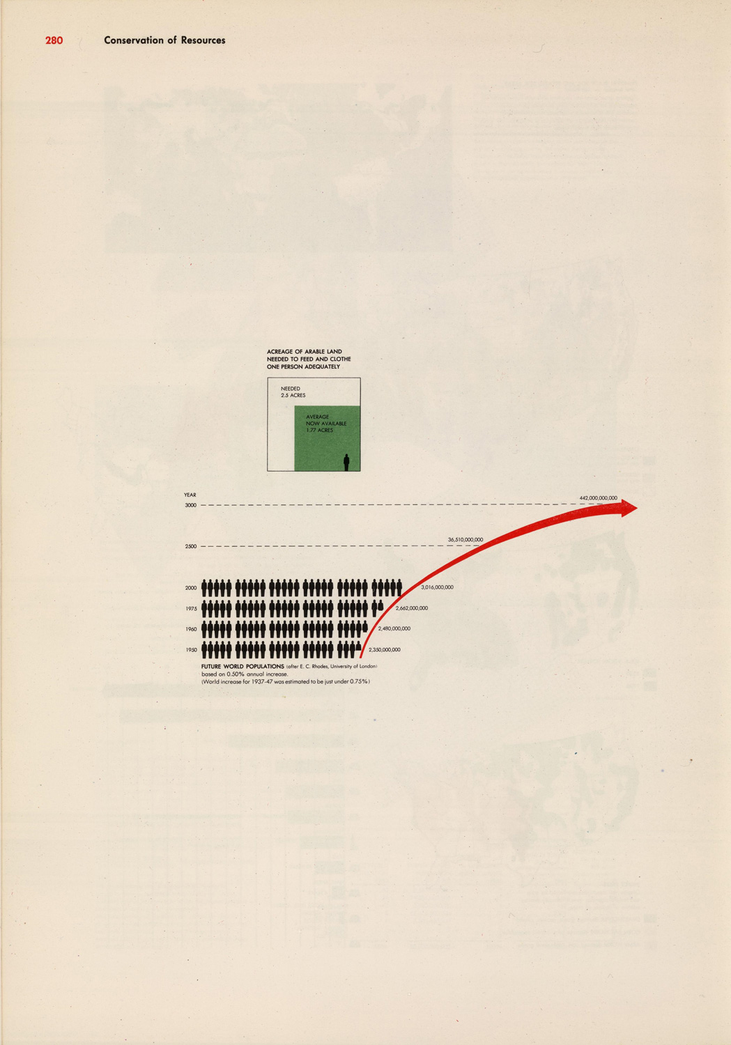 Herbert Bayer's World Geo-Graphic Atlas: A Composite of Man’s Environment, published in 1953, stands as a pioneering work that anticipated the modern age of infographics. In undertaking the atlas, Bayer addressed many environmental concerns. He confronted the topic in considerable detail, calling readers’ attention to the impossibility of sustaining humanity’s demand with Earth’s dwindling supply of natural resources. The final illustration is a graphic summary of population growth in relation to resource conservation. The graphic estimates that the world’s population would reach 3.016 billion in 2000. It in fact reached 6.114 billion.