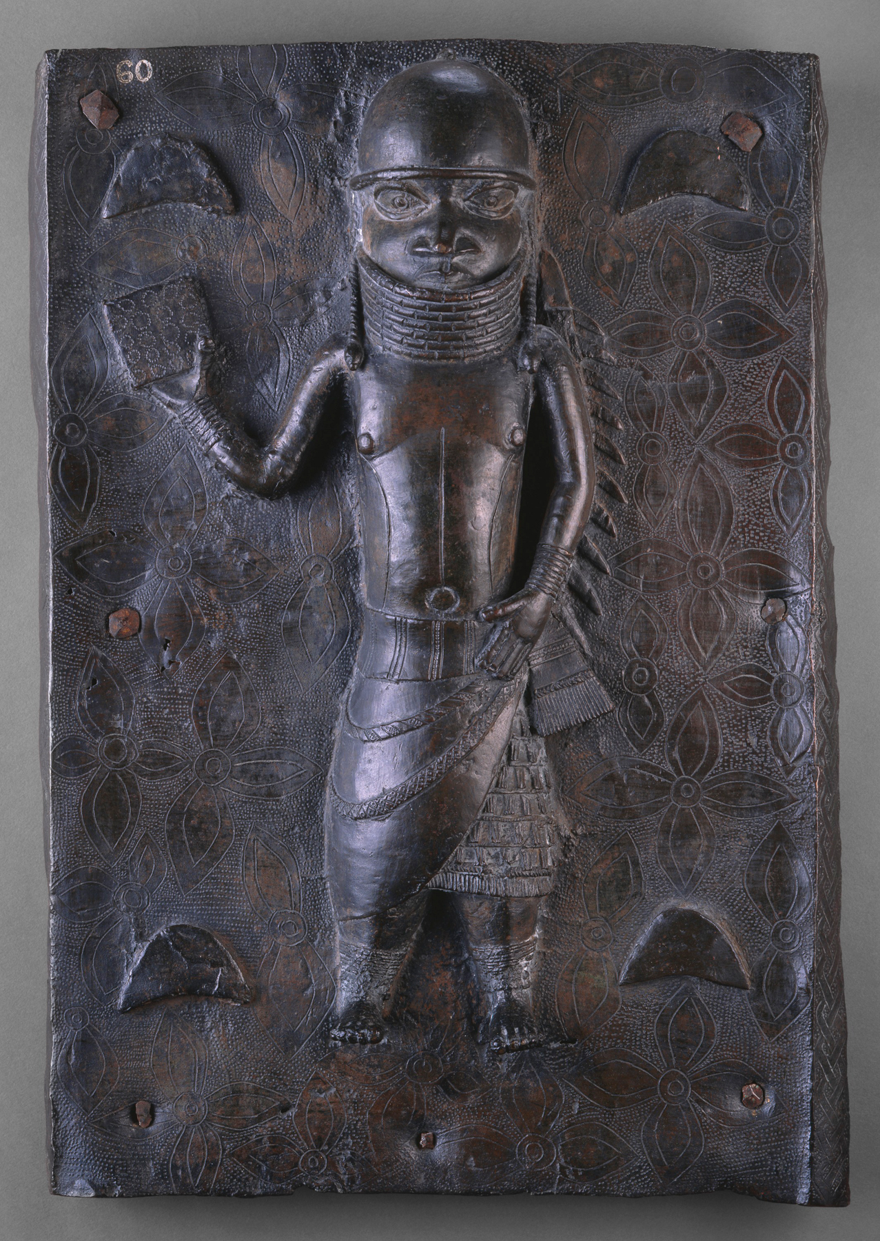 Benin artist (Nigeria) Benin Plaque, 1550–1650. Bronze; 20 1/4 in x 14 1/8 in. Work loaned out to the Denver Art Museum by the National Commission for Museums and Monuments of Nigeria in Support of the International Friendship and Collaborations Being Fostered by the Parties upon the Uncontested Return of Ancient Benin Kingdom Art to Nigeria by the Denver Art Museum.