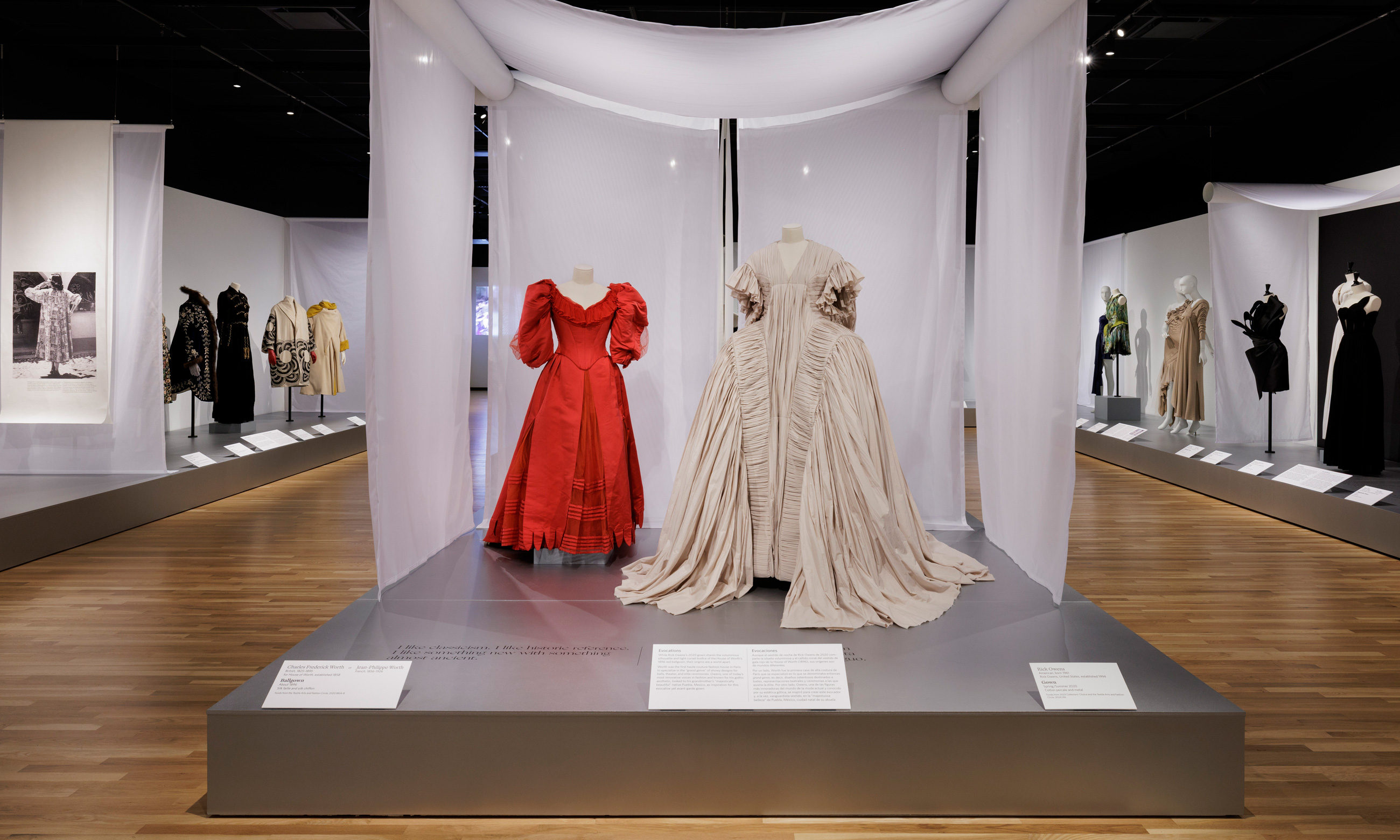 In the DAM’s Conversation Pieces: Stories from the Fashion Archives exhibition, historic garments reveal how silhouette, structure, and adornment communicate identity. Carefully shaped bodices, dramatic proportions, and deliberate embellishments show how clothing can project authority, independence, and ambition.