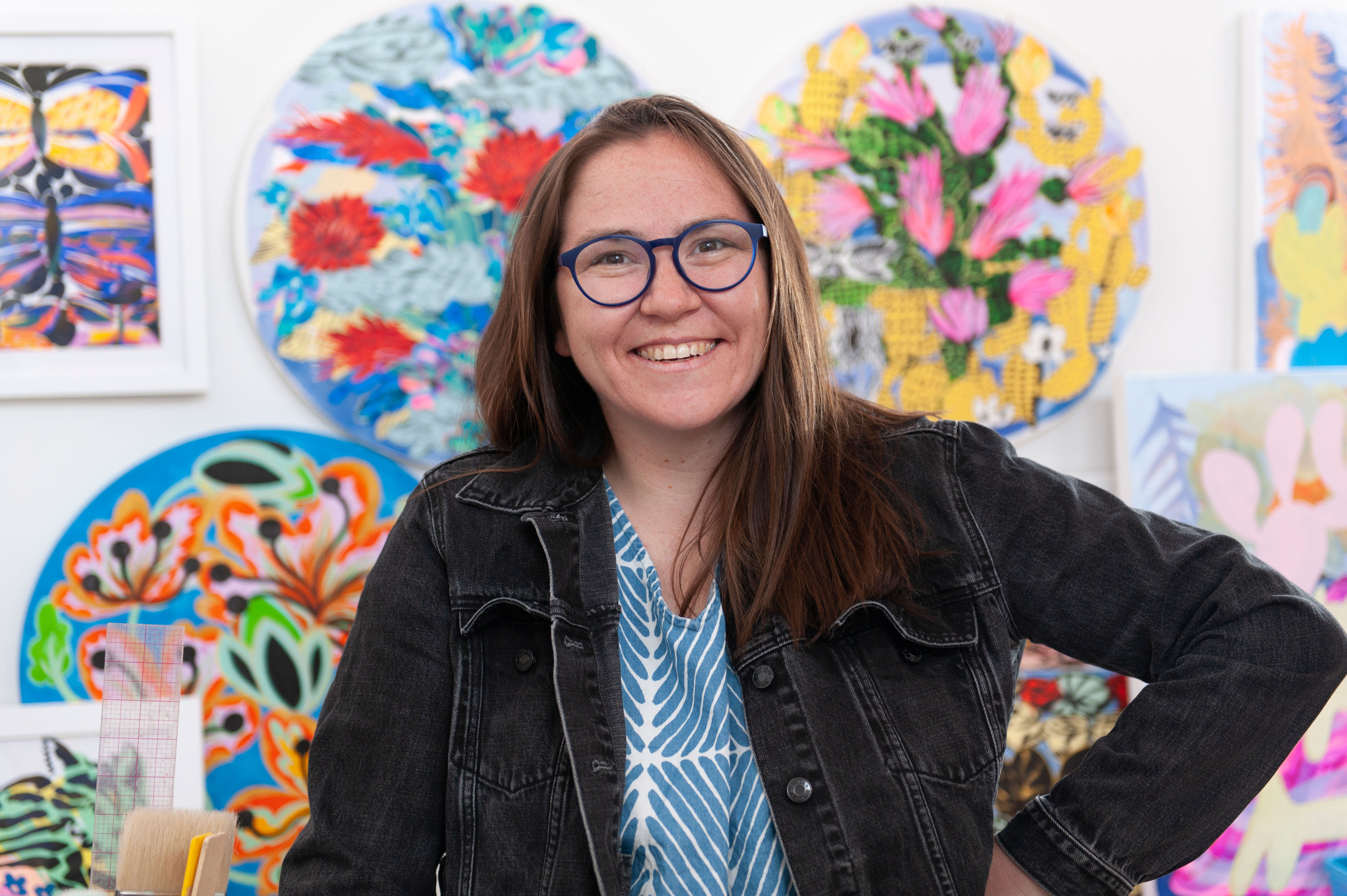 Miriam Dubinsky is a painter and printmaker utilizing screen printing as well as several types of water based media in her art practice. Recently she has been working on a new body of hand cut, screen printed and painted paper collages inspired by florals and lively color combinations. Dubinsky is very inspired by nature and the flora and fauna of where she currently lives, visiting weekly the Denver Botanical Gardens and other local nature spots within Colorado. Dubinsky hopes to engage viewers of all backgrounds with her lively, joyful and vibrant color palettes.
