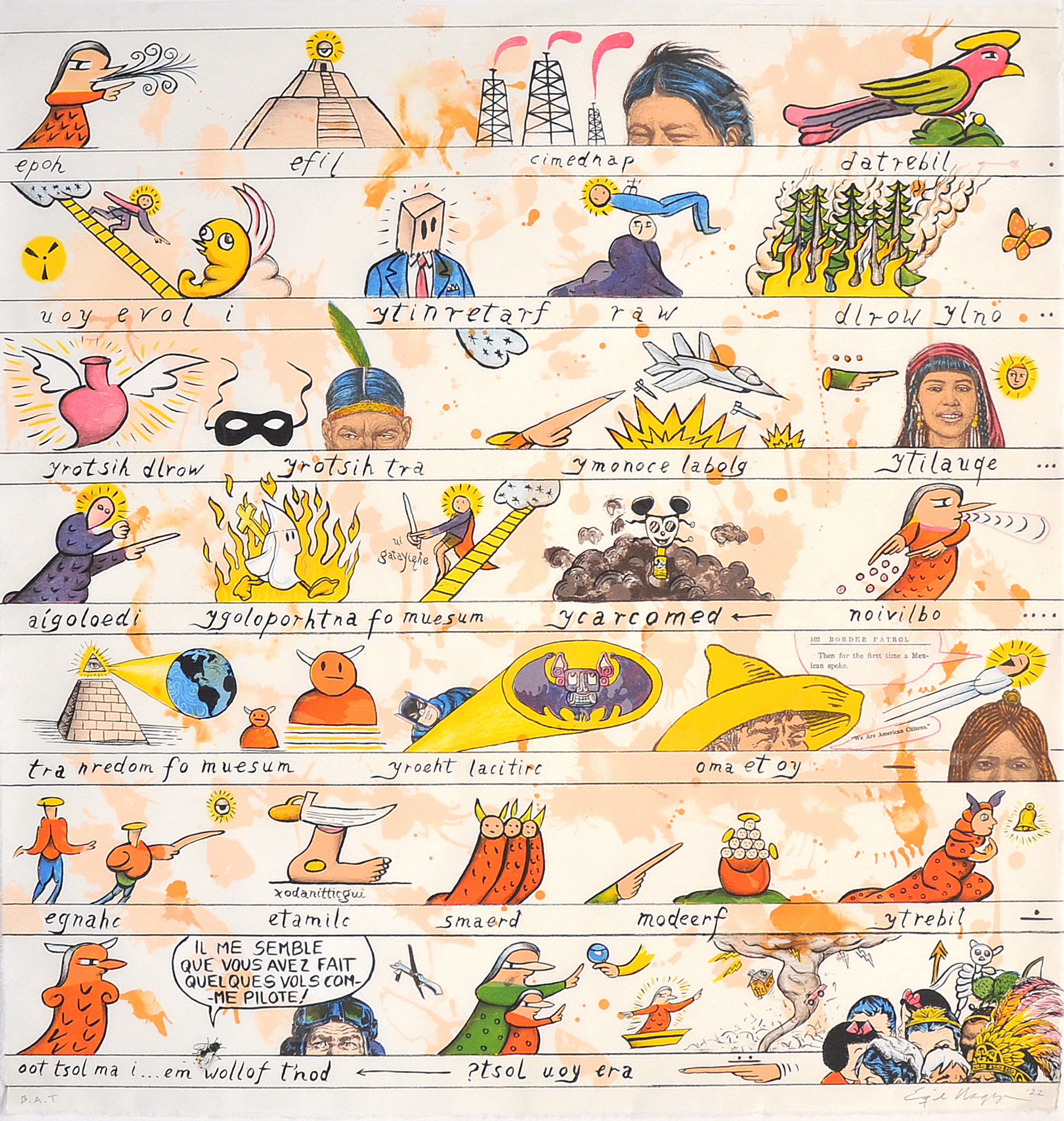 Born in 1953 in Mexico City, Mexico, Enrique Chagoya earned his BFA in printmaking in 1984 from the San Francisco Art Institute and an MA and MFA from the University of California, Berkeley. He has received national and international recognition, including a John Simon Guggenheim Memorial Fellowship, Lifetime Achievement Award from Southern Graphics Council International, Biennial Award from Louis Comfort Tiffany Foundation, and an artist fellowship and residency in Giverny, France. Chagoya has had solo exhibitions at the Des Moines Art Center, Iowa; Legion of Honor Museum, San Francisco; Nevada Museum of Art, Reno; Palm Springs Art Museum, California; and San Jose Museum of Art. His work is included in the permanent collections of Art Institute of Chicago; Detroit Museum of Art; Fine Arts Museums of San Francisco; Hammer Museum, University of California, Los Angeles; Metropolitan Museum of Art, New York; Philadelphia Museum of Art; Smithsonian Museum of American Art, Washington, DC; and Whitney Museum of American Art, New York. He resides and works in San Francisco, where he is a professor of art practice since 1995 at Stanford University.