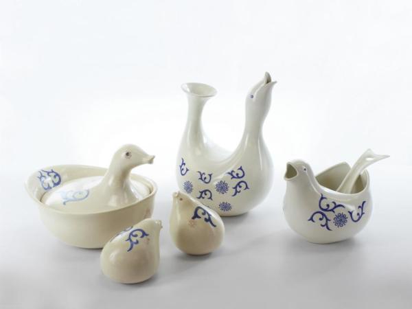 Eva Zeisel, Marmite bowl, salt, and pepper, 1953. Stoneware. Manufactured by Monmouth Pottery. Oil/vinegar bottle and gravy boat with ladle, 1964. Earthenware. Manufactured by Nihon Koshitsu Toki Company. Collection of Scott Vermillion. Photograph by Scott Vermillion.