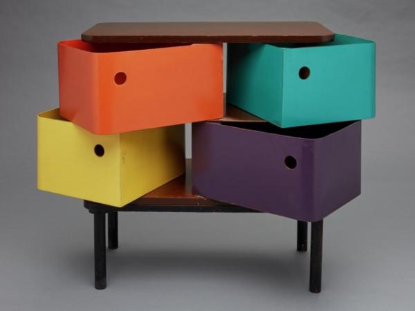 Charles and Ray Eames, Eames Storage Unit (ESU) 400 series, about 1949. Birch plywood, laminated plywood, enameled Masonite, fiberglass, and enameled steel; 59 × 27 × 17 in. Manufactured by Herman Miller. Denver Art Museum: Funds, by exchange, from Mr. and Mrs. John C. Mitchell II, Calvina Morse Vaupel in memory of Calvin Henry Morse, Mrs. George Cranmer, Charles E. Stanton, Charles Bayly Jr. Collection, Mrs. Claude Boettcher, Dr. Charles F. Shollenberger, Mr. Ronald S. Kane, Frances Charsky, Dorothy Retallack, Mrs. Alfred B. Bell, Charles William Brand, Doris W. Pritchard, Mrs. F. H. Douglas, Mrs. Calista Struby Rees, and Jane Garnsey O'Donnell, 2017.208. © Eames Office LLC (eamesoffice.com). Photograph © Denver Art Museum