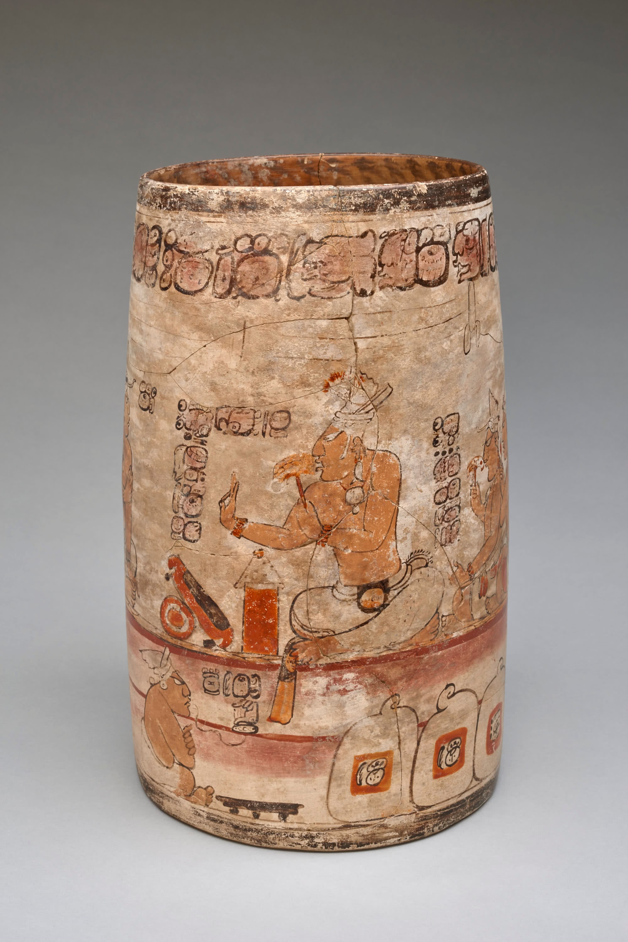 Telling a tale of social mobility, this Maya vessel shows a man with one arm outstretched and the other holding a bouquet of flowers. Behind him are his brothers, and surrounding them are all his worldly goods, including three bags of black beans, proudly presented as a display of wealth. That he could afford to commission this vessel, painted in the style of a royal palace scene, is a sign of high status.