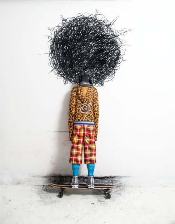 Through drawing, sculpture, and installation, Jorge Pineda denounces persistent racial stereotypes by reclaiming and elevating symbols of youth such as the hoodie, sneakers, and skateboard. The artist uses this backdrop to point out racial tensions and the effects of his search for personal identity. Here, in what appears to be a gesture of shame, Pineda’s figure turns away from us and hides his face. His exaggerated Afro hairstyle, however, makes clear what he cannot hide: his African ancestry.;
