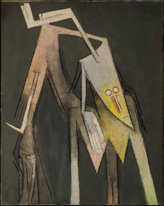 An artist of mixed Afro-Cuban-Chinese ancestry, Wifredo Lam was among the first to draw on Cuba’s Afro-Cuban cultural traditions in his work. Exposure to European surrealism resurfaced memories of his Cuban childhood and Santería religion, which he proudly incorporated into his work. His figures, neither black nor white, represent the orishas, or Santería spirits.