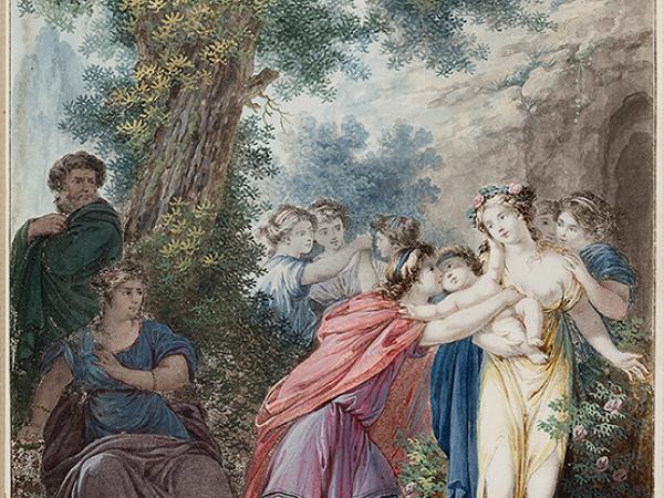 Jean-Guillaume Moitte, Telemachus Embracing Love Held in the Arms of Eucharis, about 1785. Watercolor, gouache and black chalk on parchment; ruled border in black ink; 8 x 5-3/4 in. Lent by Dr. Esmond Bradley Martin.