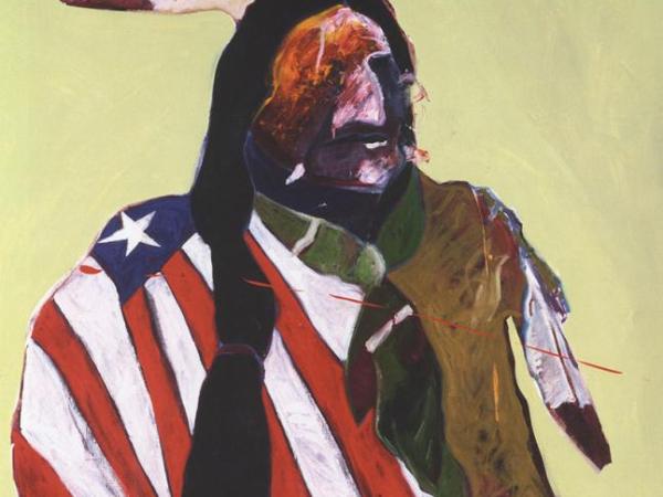 Fritz Scholder, American Portrait with Flag, 1979. Oil paint on canvas; 40 × 35 in.. Courtesy of American Museum of Western Art—The Anschutz Collection. Photo courtesy William J. O’Connor. © Estate of Fritz Scholder.