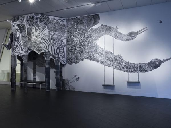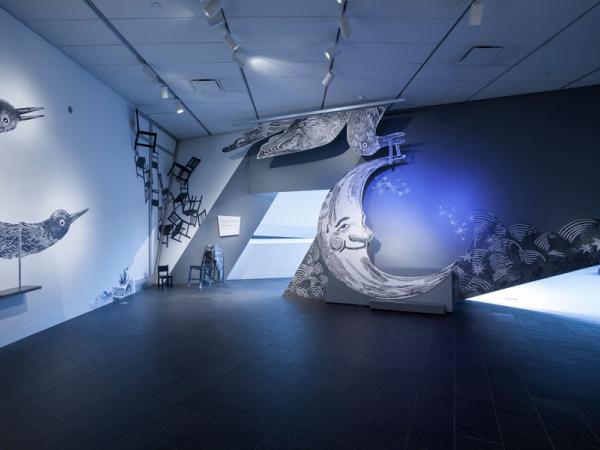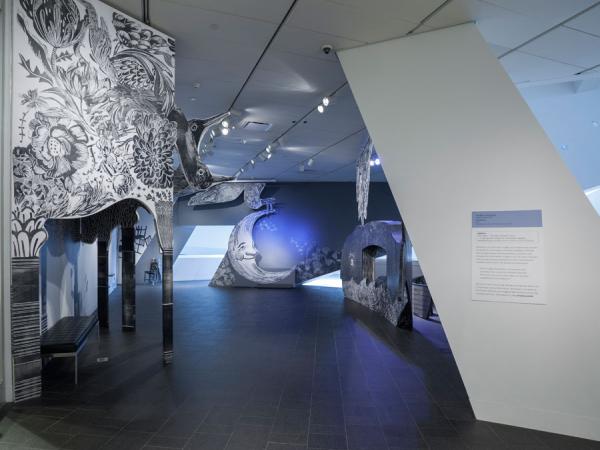 Intrigued by the dramatic angles and tucked-away spaces of the Denver Art Museum's Hamilton Building, Colorado artist Hadley Hooper illustrated, printed, scanned, and enlarged her hand-drawn images to set the scene. Hooper's work as a picture book illustrator and her connection to creation myths inspired this theatrical environment.